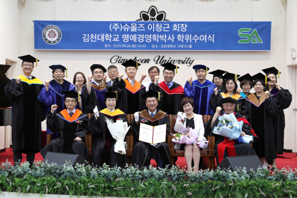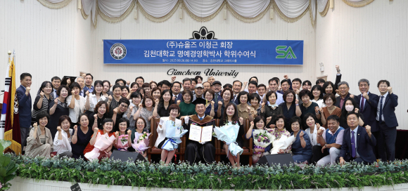 [김천=로컬타임즈] 김천대학교(총장 윤옥현)는 지난 26일 오후 2시 교내 그레이스홀에서 ㈜슈올즈 이청근 회장에게 명예경영학박사 학위를 수여했습니다. 이날 수여식에는 최명희 여사 등 가족과 학계 및 재계 인사, 대학 교직원 등이 참석해 이 회장의 학위 취득을 축하했습니다.
